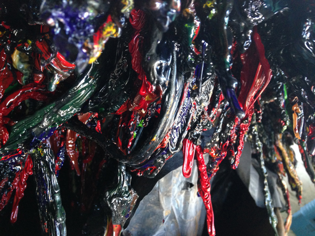 Last year I used my collection of plastic flotsam. This year I went messy. Having spent the last 18 months behind the doors of recycling and recovery facilities for my other job (Co-director of Design at the RSA and project director of The Great Recovery) I now find it very hard to throw things away. It’s kind of a magpie complex what others see as waste, I seem to see beauty, colour, opportunity.