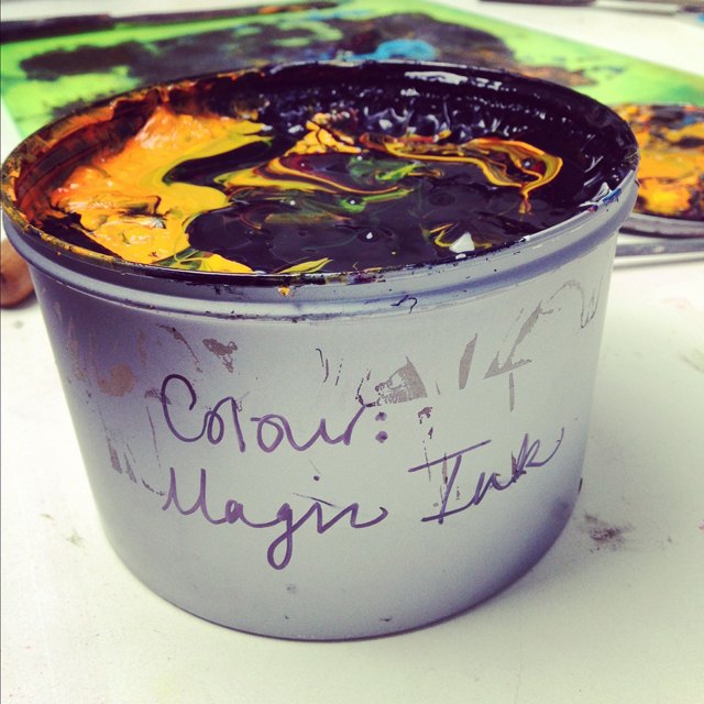 This vat of ink is sticky smelly and gloopy but full of colours of the rainbow from past jobs – annual reports, comics, art books, posters, promotional leaflets…lovely. I pull some out and mark up the tin; ‘magic ink’ and take it back to the studio.