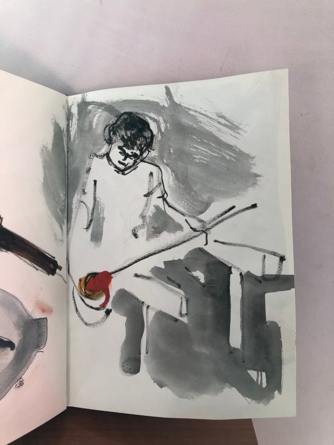 I am still working on my life drawing of people and drawing glassblowers is particularly challenging. It is like choreographed movement as they constantly move with the molten hot glass.